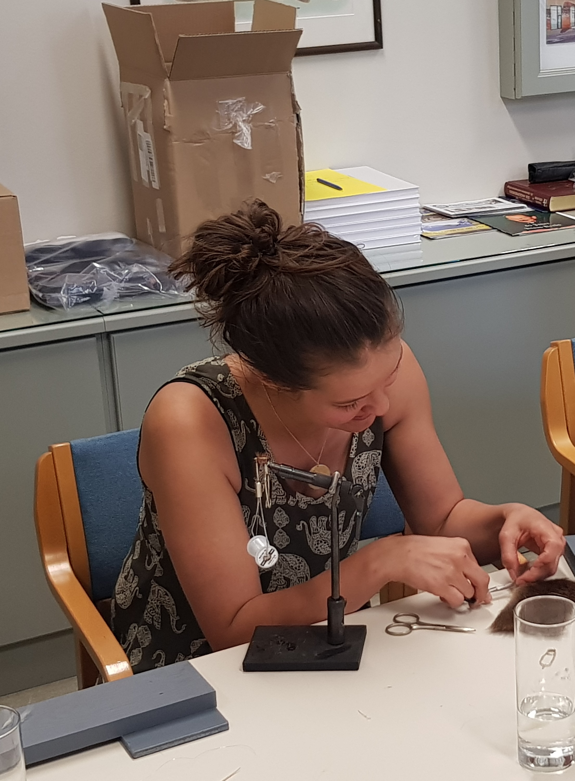 Resultierend aus einerseits der wirklich hilf- und lehrreichen Erklärungen und Vorführungen unserer „Instruktoren“ sowie der geschickten Handfertigkeiten der Gruppe haben wir es tatsächlich geschafft, zwei Fliegen zu binden, die vermutlich freudig darauf warten, mit der Fliegenrute in Einsatz zu kommen.