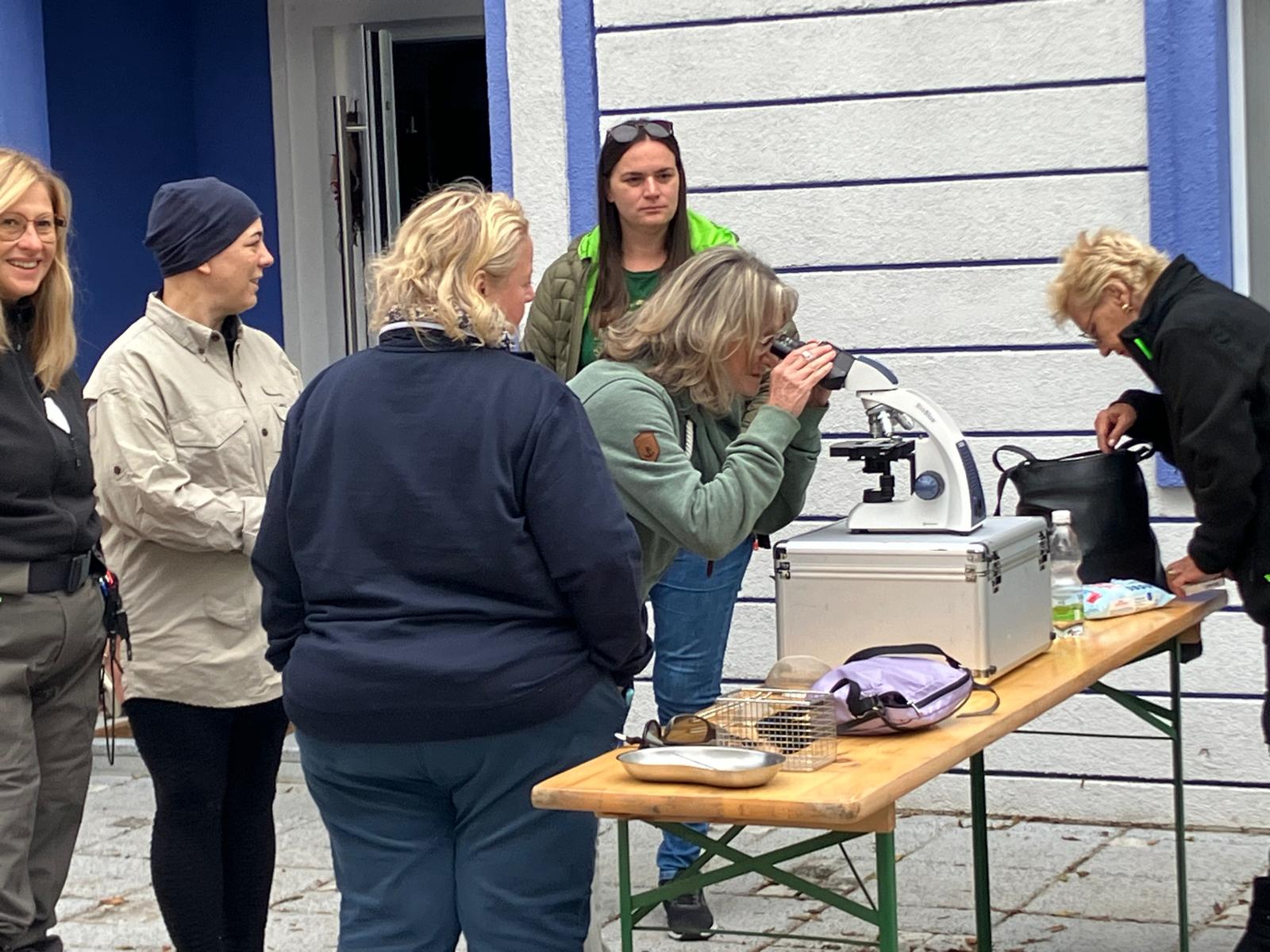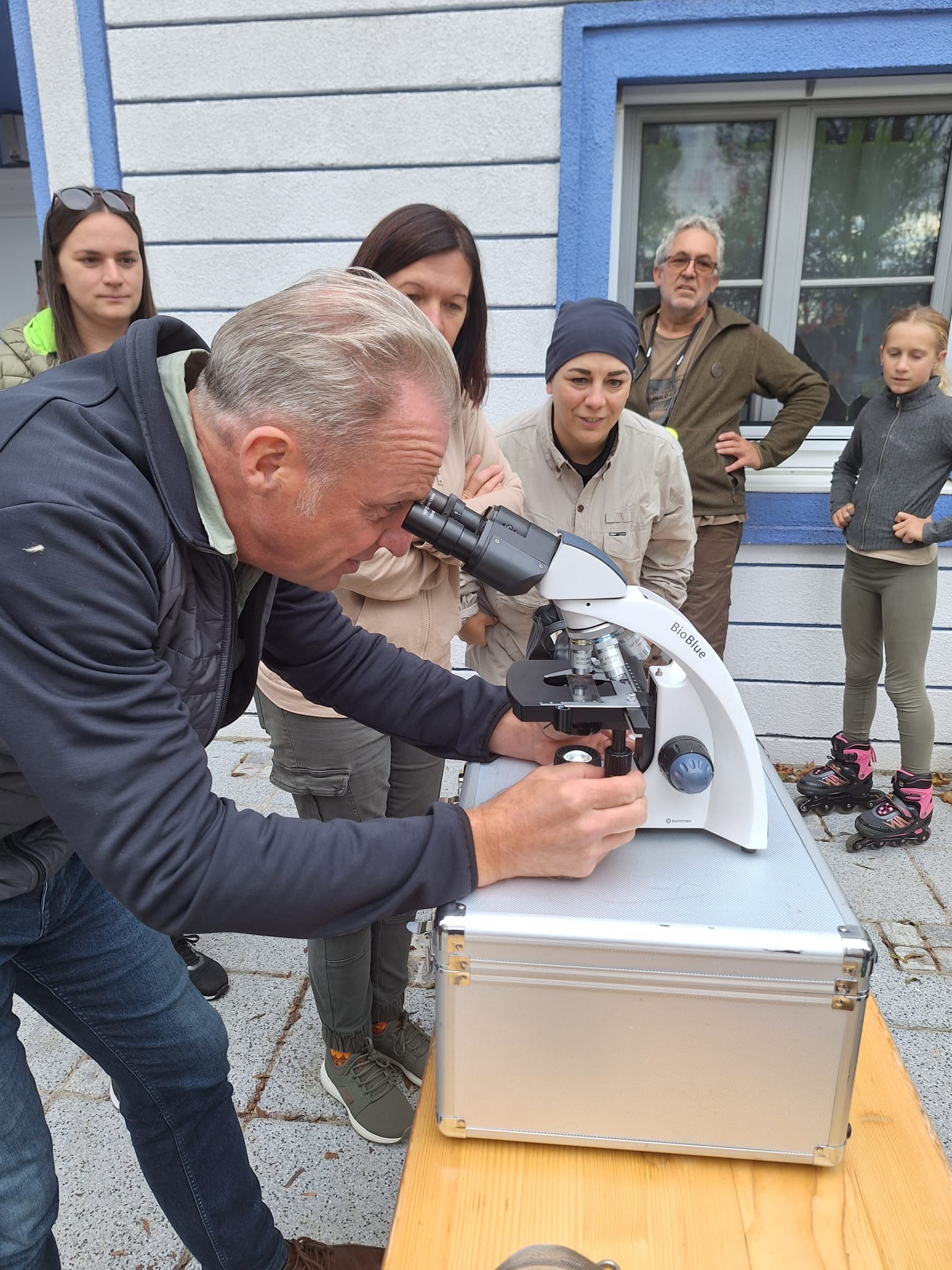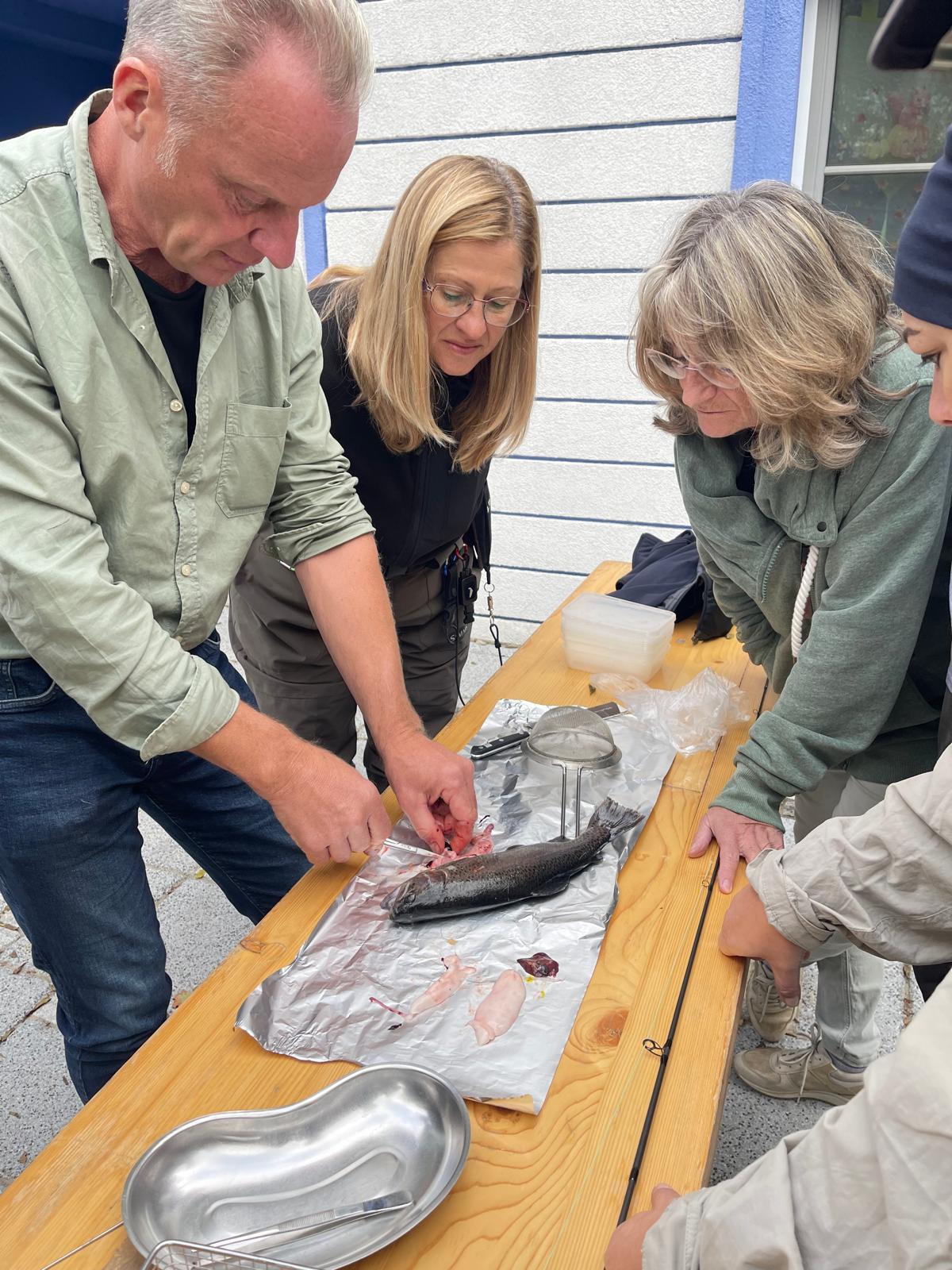 Knapp nach 14 Uhr trafen wir neuerlich zusammen um mit VetR DiplTA Dr. Heinz Heistinger Fisch,- Insekten - und Wasserkunde abzuhalten. Den theoretischen Teil, in welchem Insektenkunde (Stadien der Insekten, Unterschiede, etc.) uns erklärt wurde, fand in gemütlicher Atmosphäre bei steirischer Brotzeit statt. Im Anschluss wurde eine gefangene Regenbogenforelle seitens Dr. Heistinger fachmännisch geöffnet und der Fisch (Organe, usw.) erklärt. Auch wurden typische Fischkrankheiten angesprochen und wie oder wo diese erkennbar sind. In Folge gingen alle zusammen ans Wasser, um mit Behälter Insekten zu suchen, diese erklärt zu bekommen bzw. auch unter dem Mikroskop genauer kennen zu lernen.